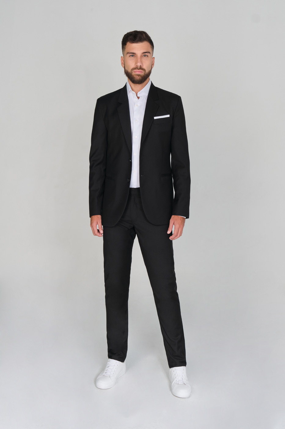 100% Paño Tropical - Chaqueta: 2 Boton - Bolsillos Con Tapa - Pantalon: Pretina Cruzada Con Pasadores - Bolsillos Diagonales - Accesorios: Corbatin Negro - Pañuelo Plata - Chaleco Satin Plata 5 Botones