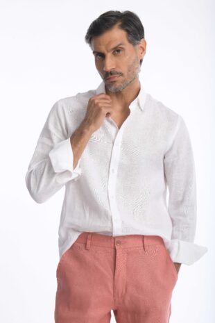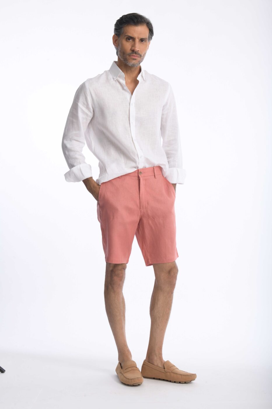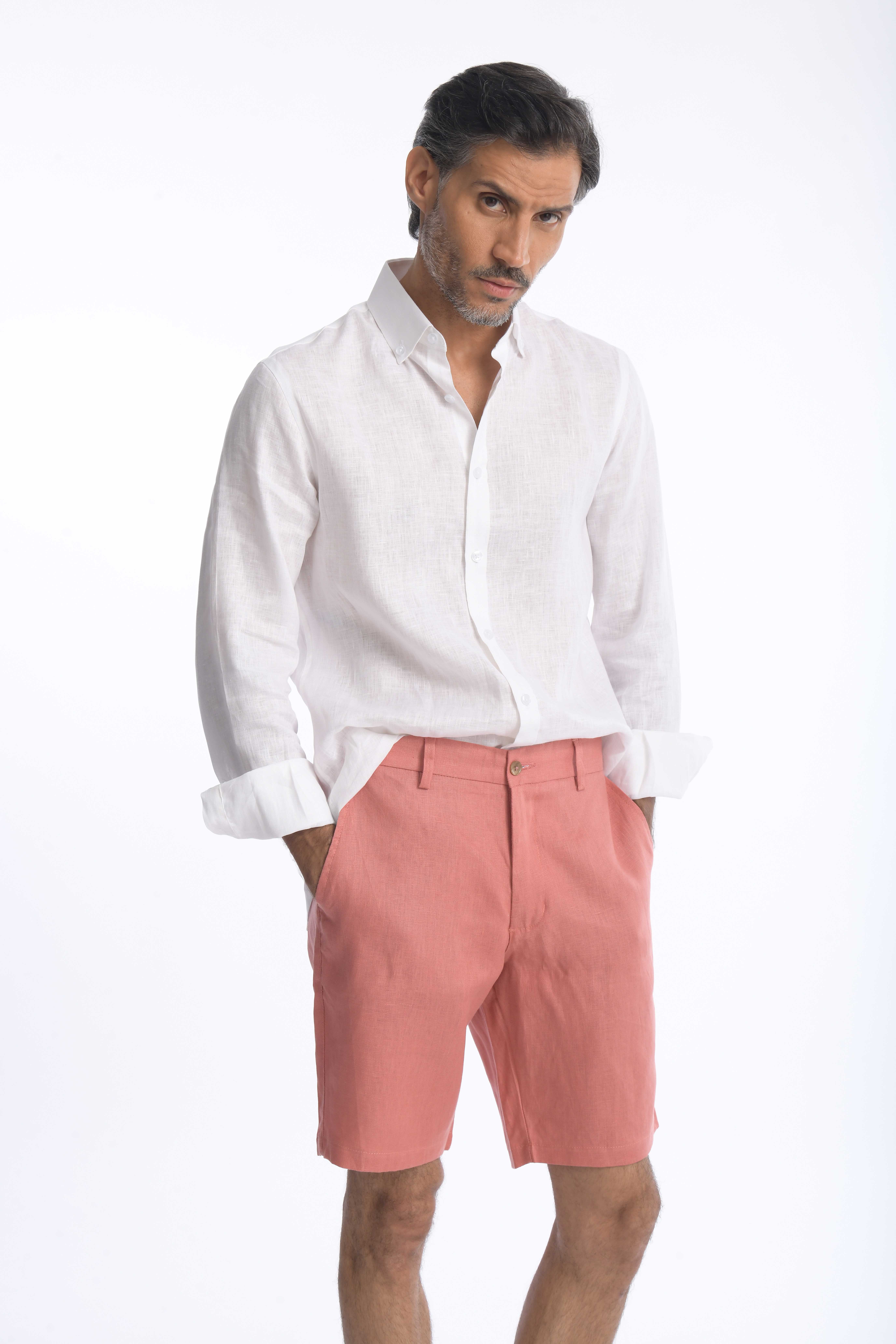 Bermuda para hombre en 100% lino, fresca, ligera y transpirable. Corte slim fit con bolsillos laterales y posteriores para un look cómodo y sofisticado.