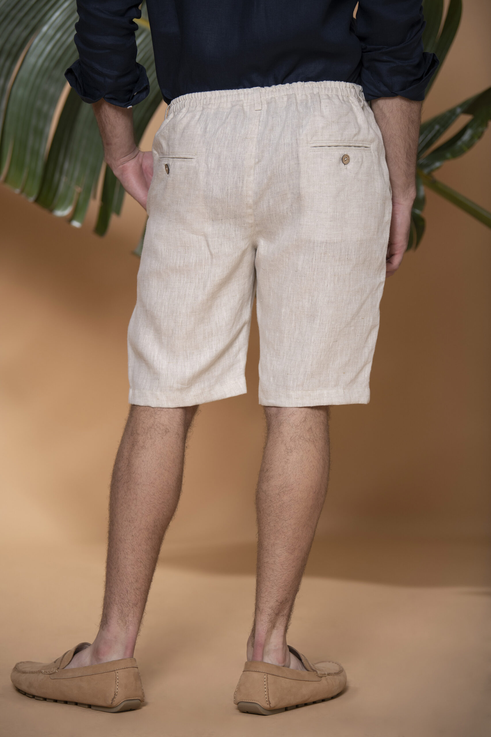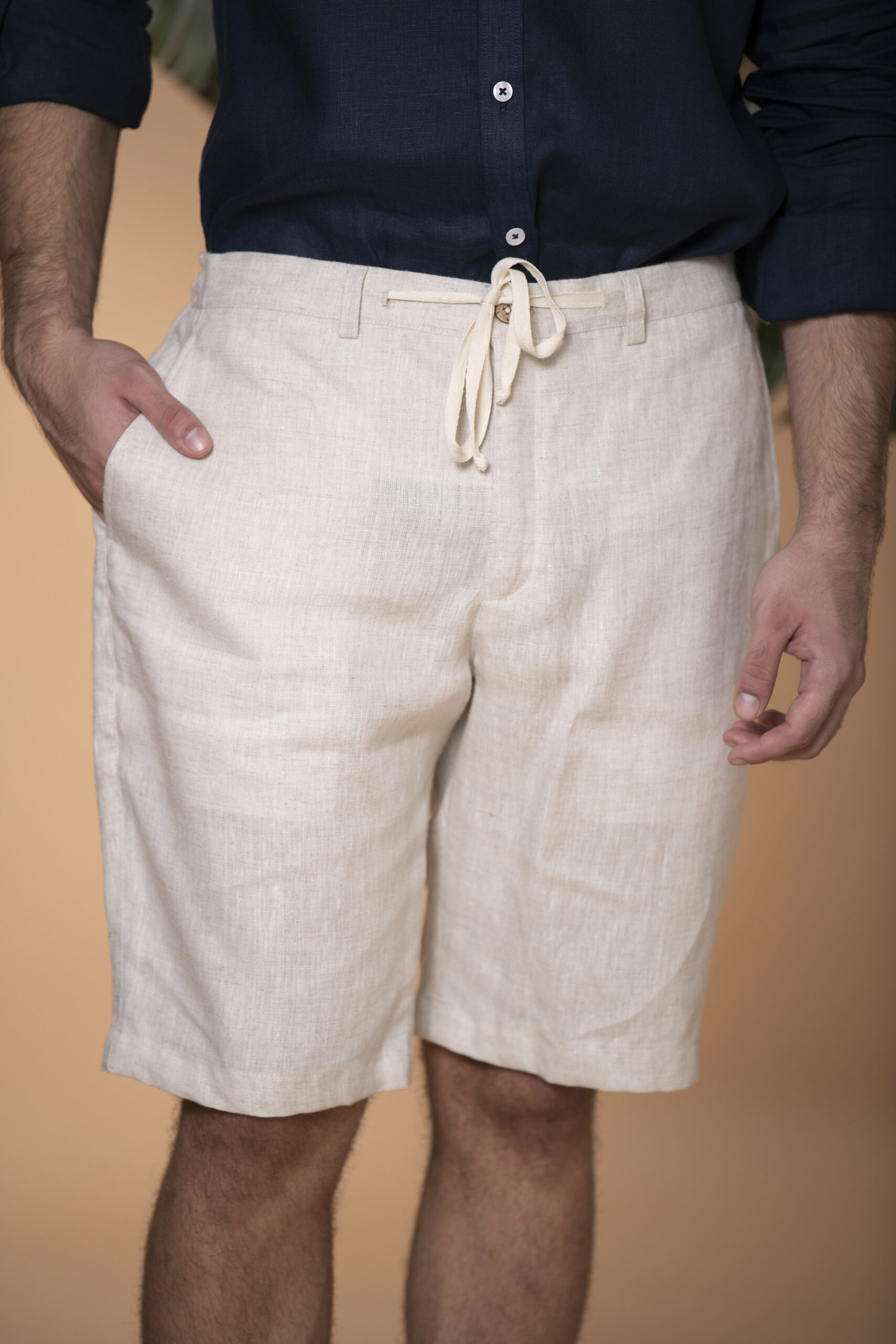 Bermuda confeccionada con tejido 100% lino. Cierre frontal por cremallera y botón. Dos bolsillos de doble ribete y botón en la parte posterior. Cintura elástica ajustable mediante cordón hiladilla. Dos bolsillos delanteros diagonales.