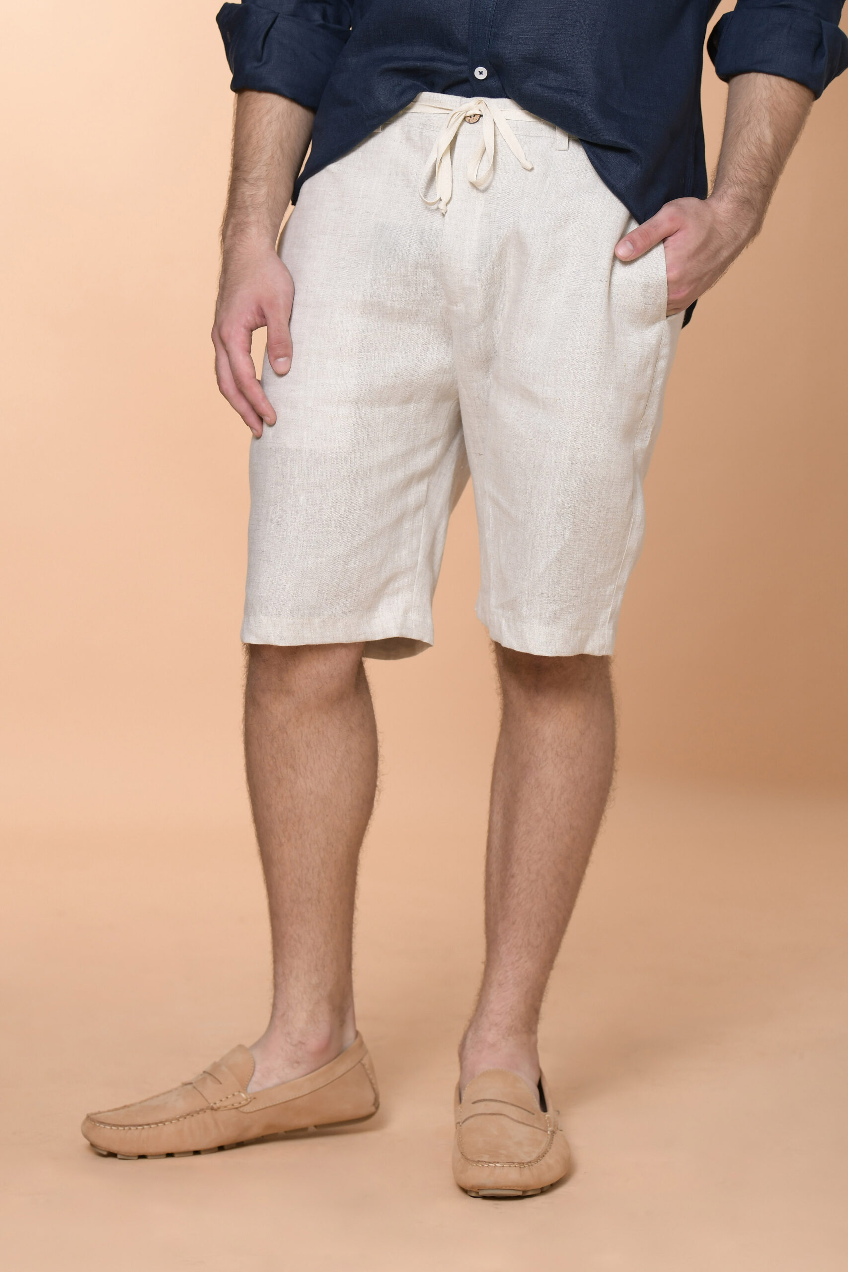 Bermuda confeccionada con tejido 100% lino. Cierre frontal por cremallera y botón. Dos bolsillos de doble ribete y botón en la parte posterior. Cintura elástica ajustable mediante cordón hiladilla. Dos bolsillos delanteros diagonales.