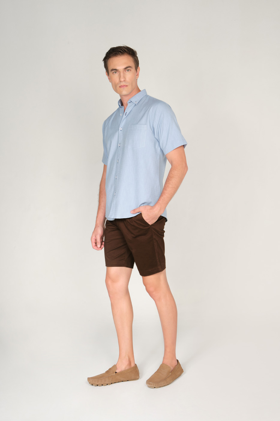 BERMUDA 100% ALGODÓN – CORTE SLIM FIT – PRETINA CRUZADA – DOS BOLSILLOS LATERALES – DOS BOLSILLOS DOBLE CON BOTÓN RIBETE EN LA PARTE POSTERIOR