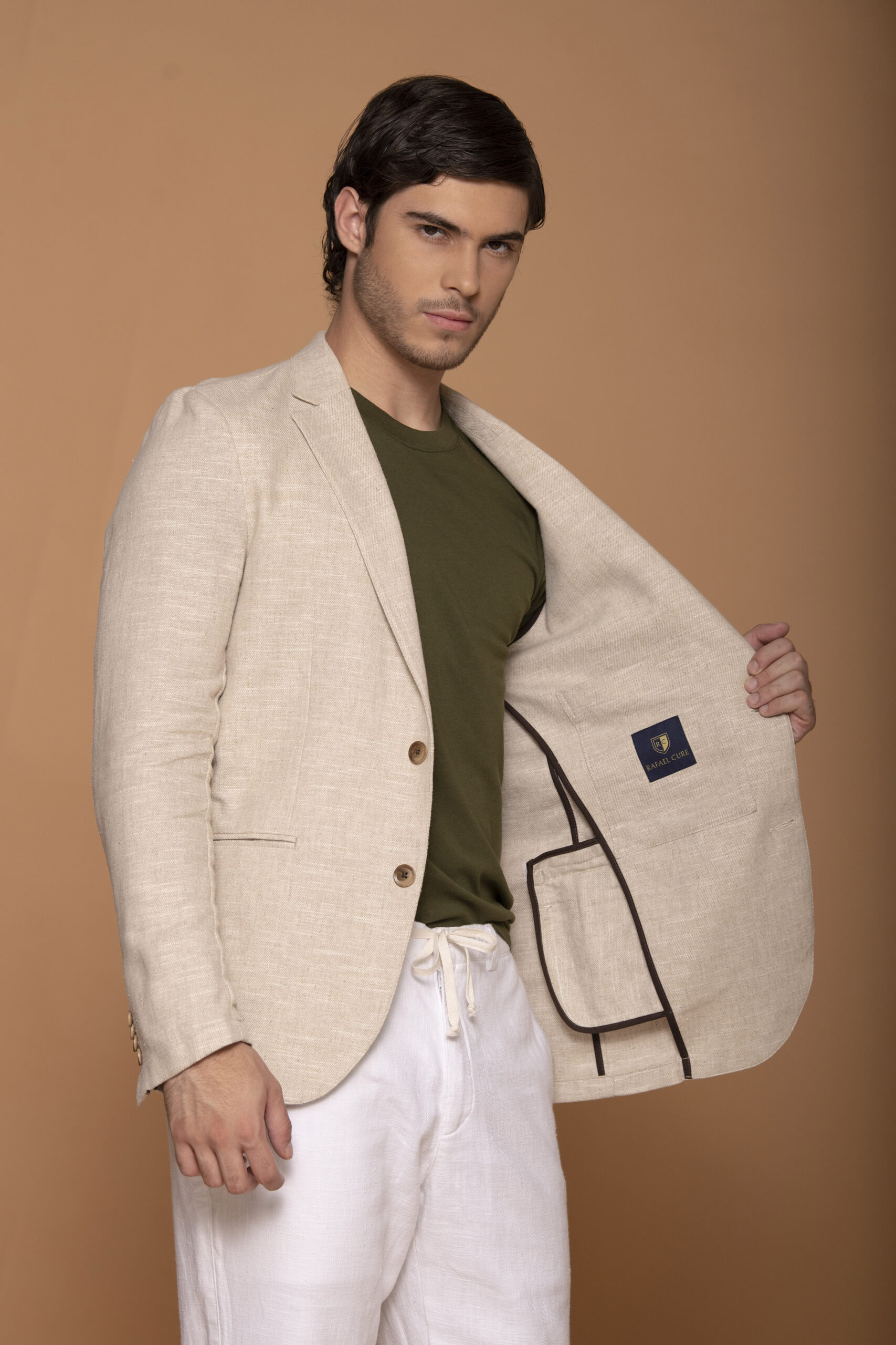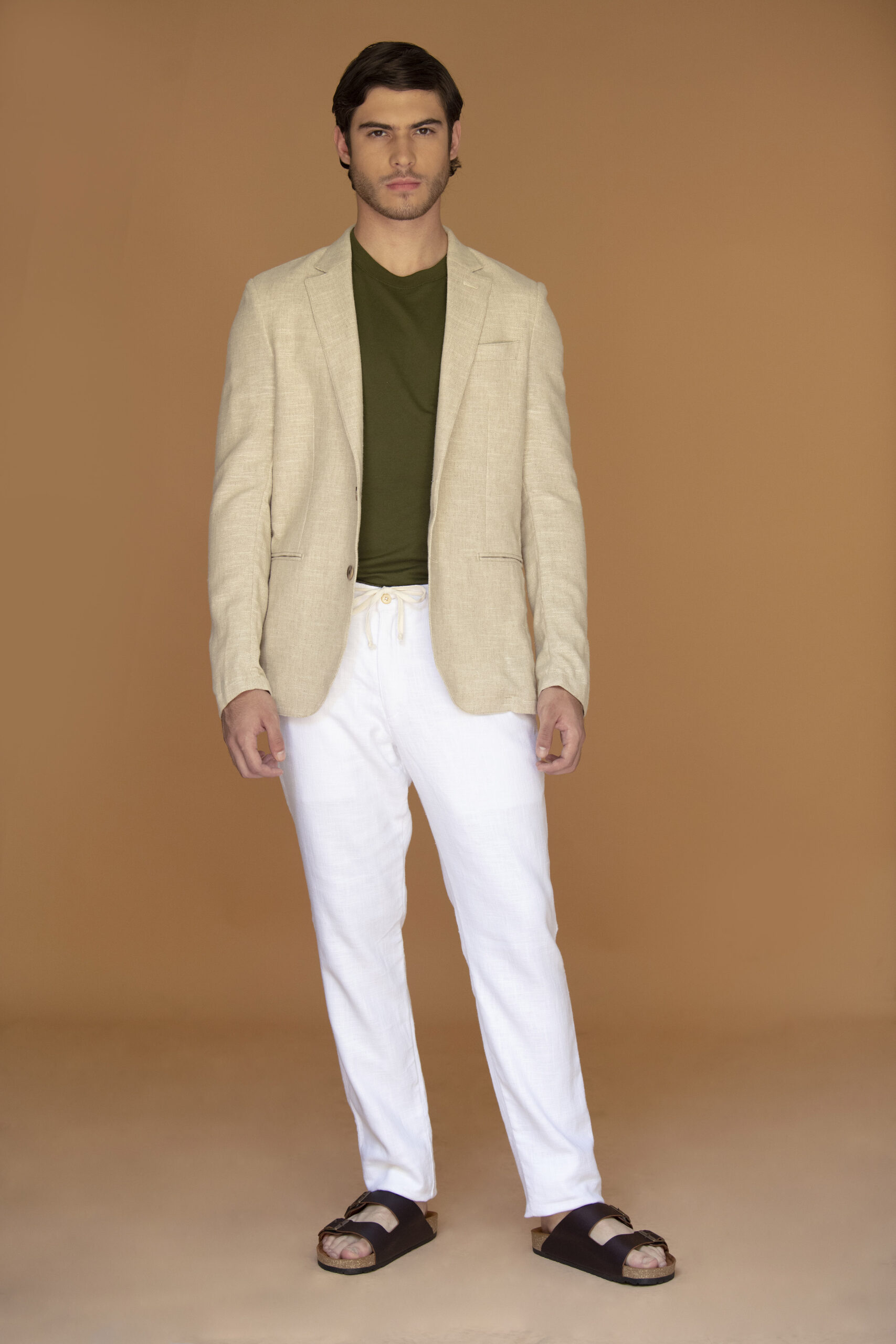 Blazer confeccionada con tejido 100% lino. Solapa clásica y ojal. Bolsillo doble ribete en la parte frontal. Cierre delantero con botones. Puños de tira abotonada. Una abertura posterior. Bolsillo interior. Sin forro interior.
