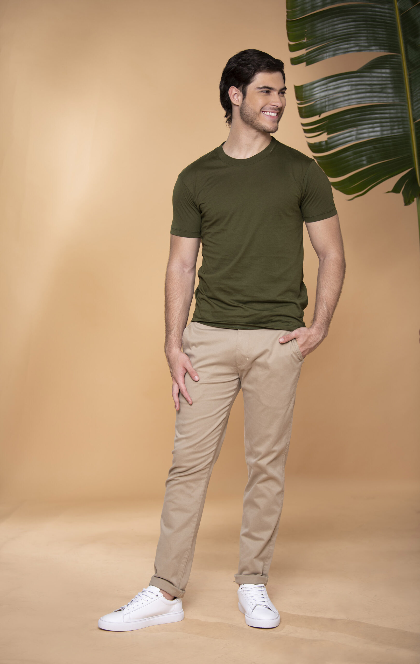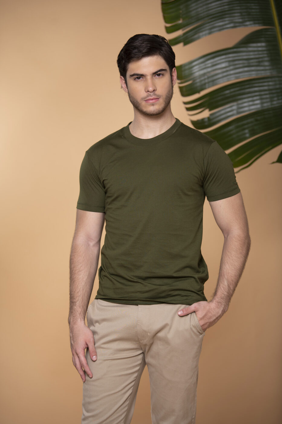 Camiseta confeccionada con tejido 100% algodón pima. Silueta ligeramente ajustada al cuerpo, proporcionando un aspecto más definido y estilizado. Cuello redondo. Manga corta.