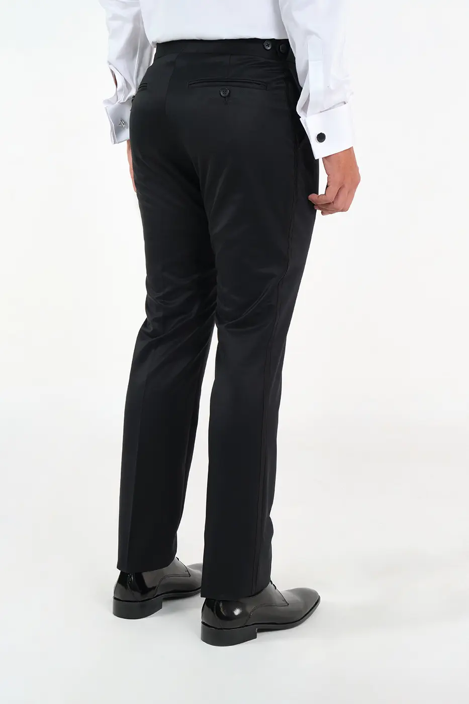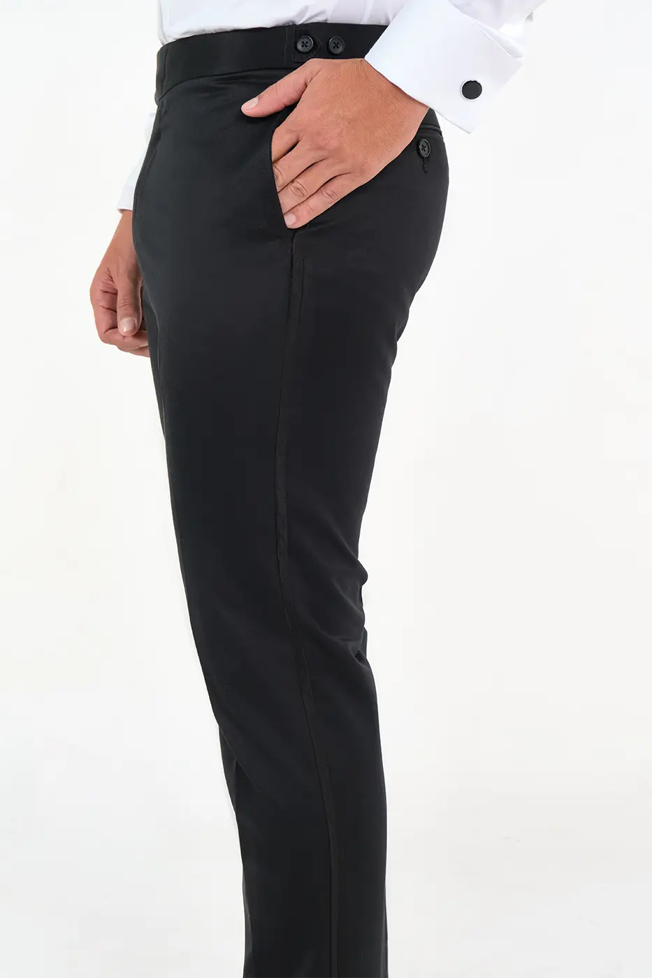 Pantalón Gala. Paño. Slim Fit. Diseño Pretina Cruzada Con Broche y Ajustables Laterales Con Botón. Bolsillos Rectos. Galón Satinado Lateral. Bolsillos Traseros Doble Ribete Con Botón.