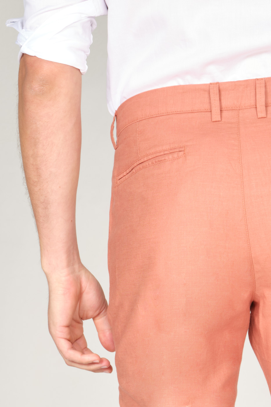 Pantalón 100% lino – corte classic fit – dos bolsillos laterales – dos bolsillos doble ribete en la parte posterior.