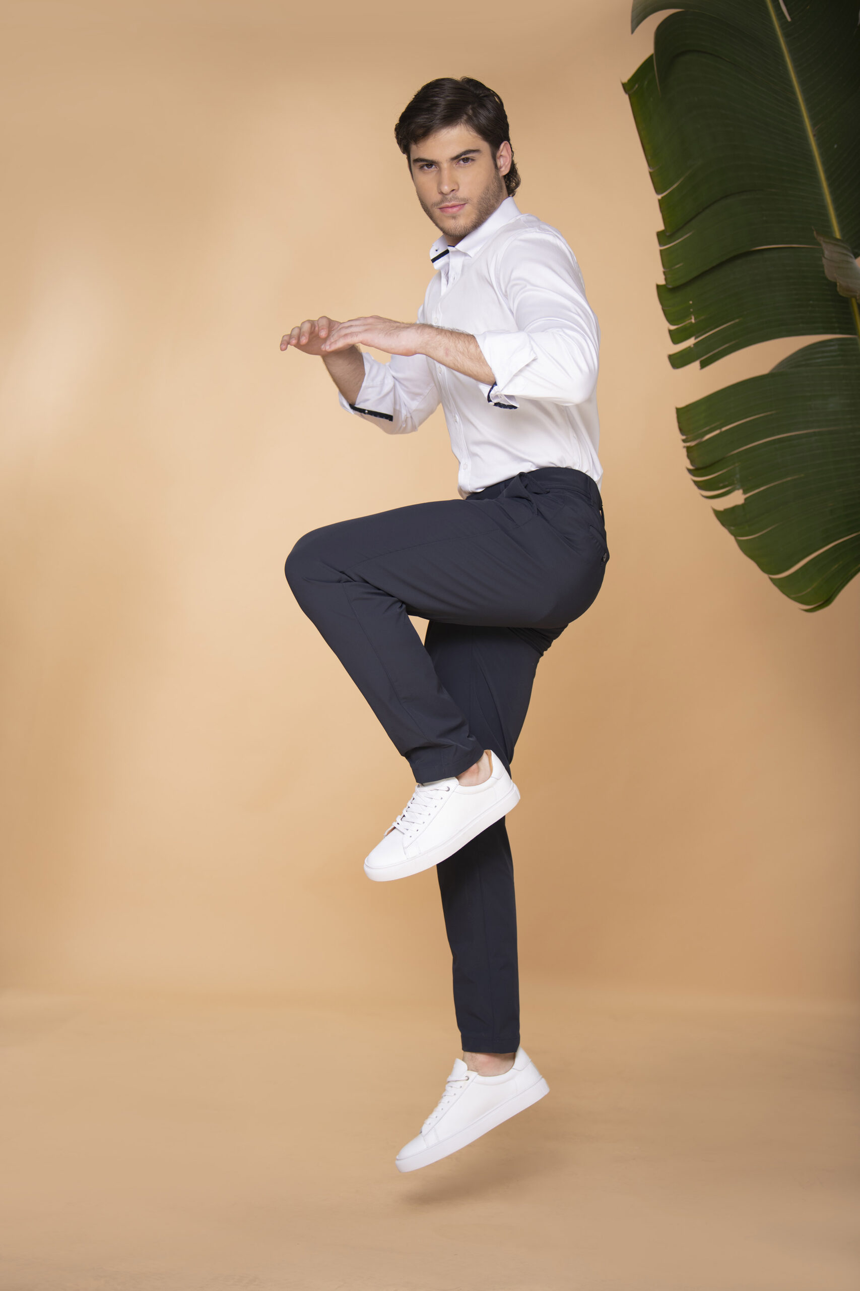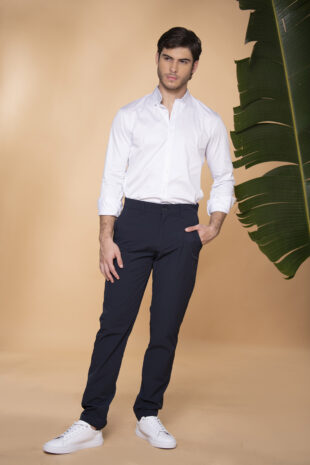 Pantalón confeccionado en tejido strech con mezcla de nylon. Pantalón Slim fit: este fit presenta una silueta ligeramente ajustada al cuerpo, ceñida en la cintura y las piernas. Cintura con pasadores. Cierre frontal por cremallera y botón.  Bolsillos delanteros diagonales. Bolsillos ribete con botón en la parte posterior.