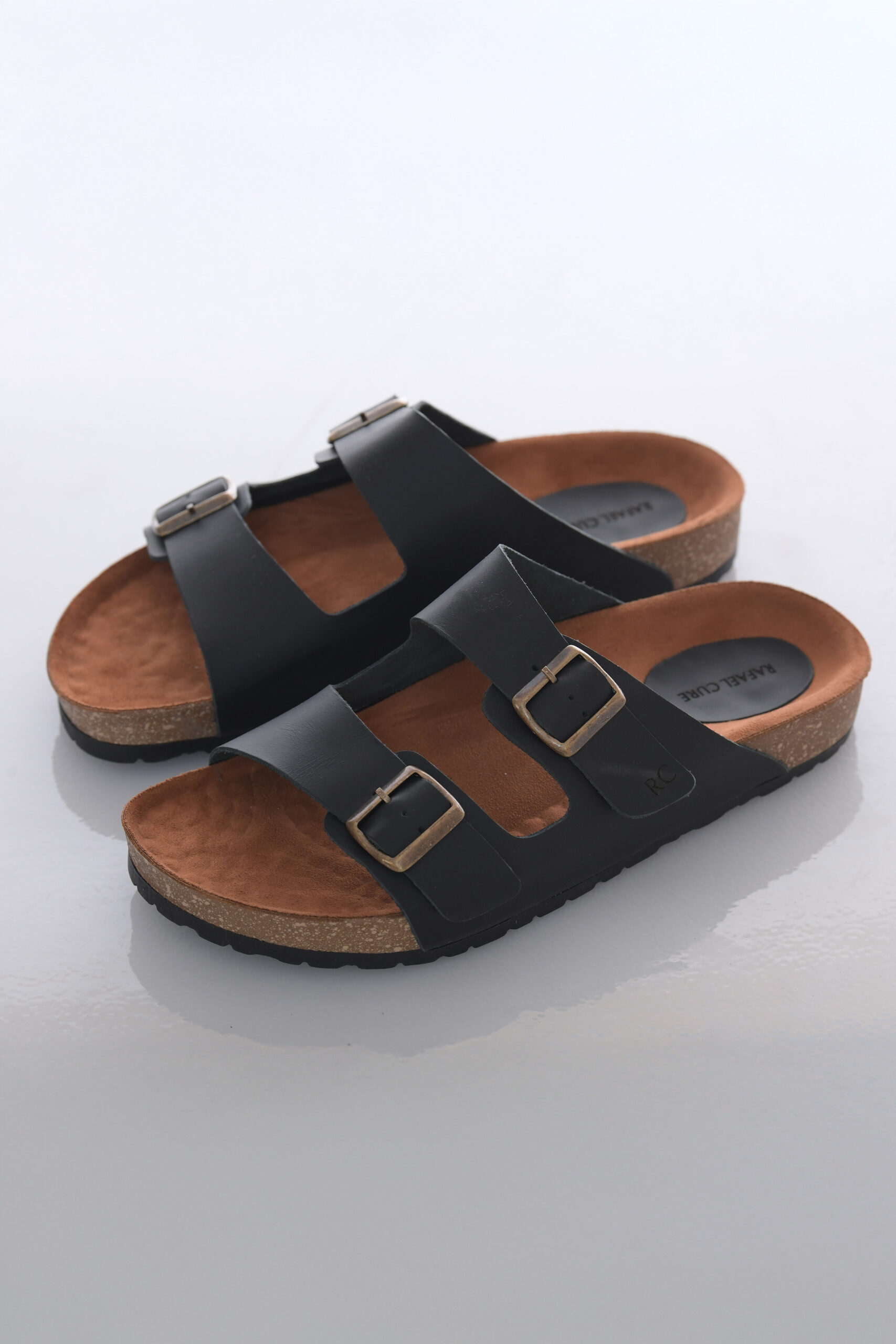 100% cuero. Doble tira ancha en el empeine con cierre de hebilla metálica. Suela tipo corcho. Forro Interior y planta de cuero.