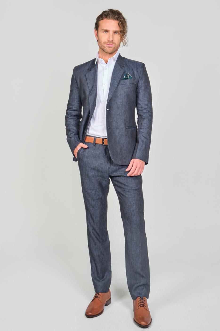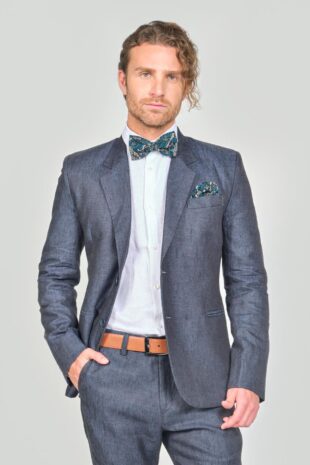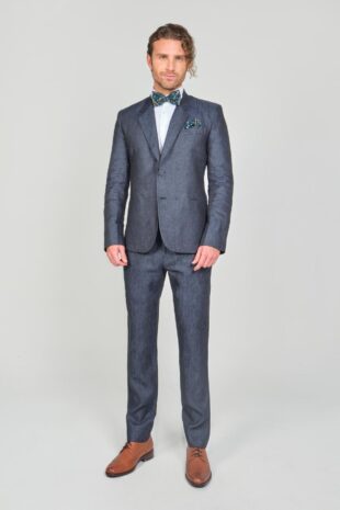100% Lino – Chaqueta: 2 Botones – Bolsillos Doble Ribete – Pantalon: Pretina Cruzada – Bolsillos Diagonales – Accesorios: Corbatin – Pañuelo – Correa Cuero Bronce