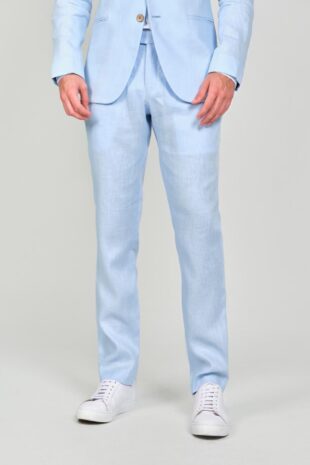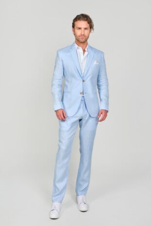 100% Lino – Chaqueta: 2 Botones – Bolsillos Doble Ribete – Pantalon: Pretina Cruzada – Bolsillos Diagonales – Accesorios: Pañuelo Blanco – Calzado Tenis Blanco