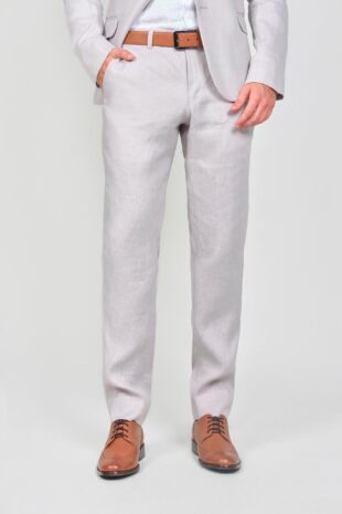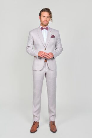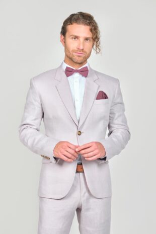 100% Lino – Chaqueta: 2 Botones – Bolsillos Con Tapa – Pantalon: Pretina Cruzada – Bolsillos Diagonales – Accesorios: Corbatin – Pañuelo – Correa Cuero Bronce