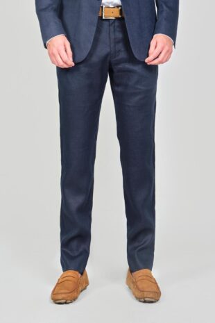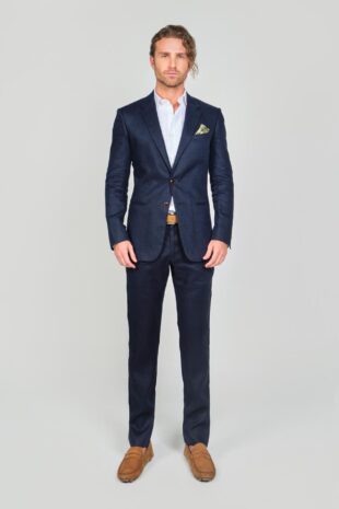 100% Lino – Chaqueta: 2 Botones – Bolsillos Doble Ribete – Pantalon: Pretina Cruzada – Bolsillos Diagonales – Accesorios: Pañuelo De Seda – Correa Cuero Miel