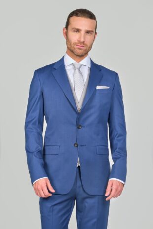 100% Paño Tropical – Chaqueta: 2 Boton – Bolsillos Con Tapa – Pantalon: Pretina Cruzada Con Pasadores – Bolsillos Diagonales – Accesorios: Corbata – Pañuelo Plata – Chaleco Paño Tropical Gris 5 Botones