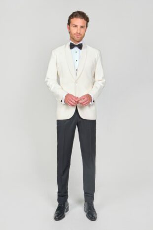 100% Paño Tropical – Chaqueta: 1 Boton – Bolsillos Con Tapa – Pantalon: Pretina Cruzada – Bolsillos Rectos – Galon Satin Negro En El Costado Accesorios: Botonadura – Corbatin Negro