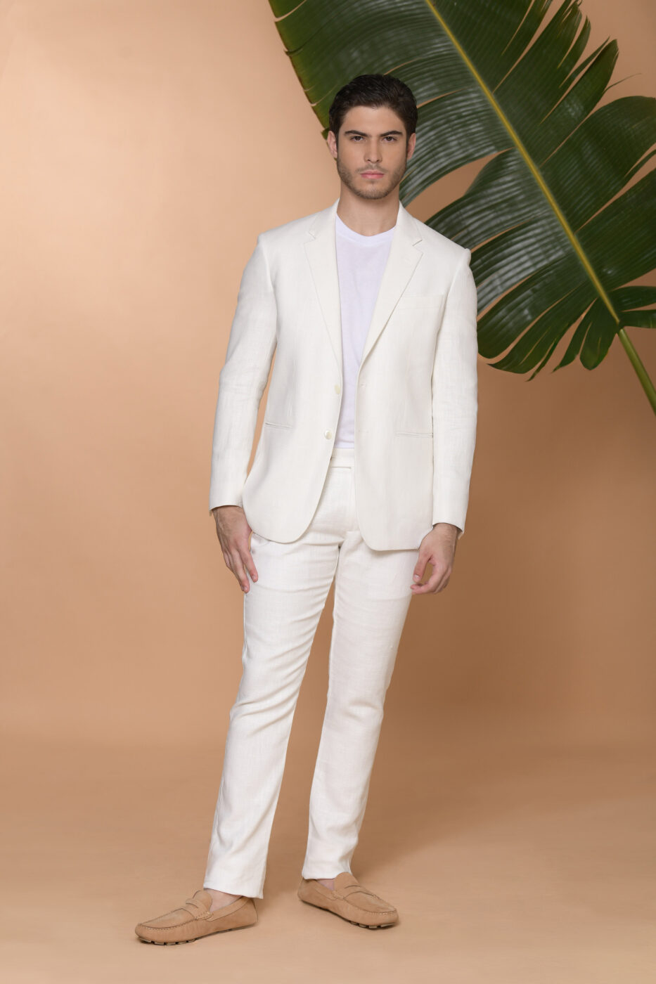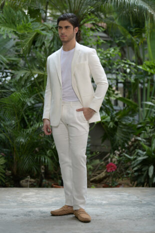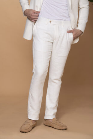 Pantalón confeccionado en tejido 100% lino. Slim fit: este fit presenta una silueta ligeramente ajustada al cuerpo, ceñida en la cintura y las piernas. Pretina cruzada. Cierre mediante cremallera con botón frontal y botón interior. Dos bolsillos laterales diagonales. Dos bolsillos doble ribete en la parte posterior.