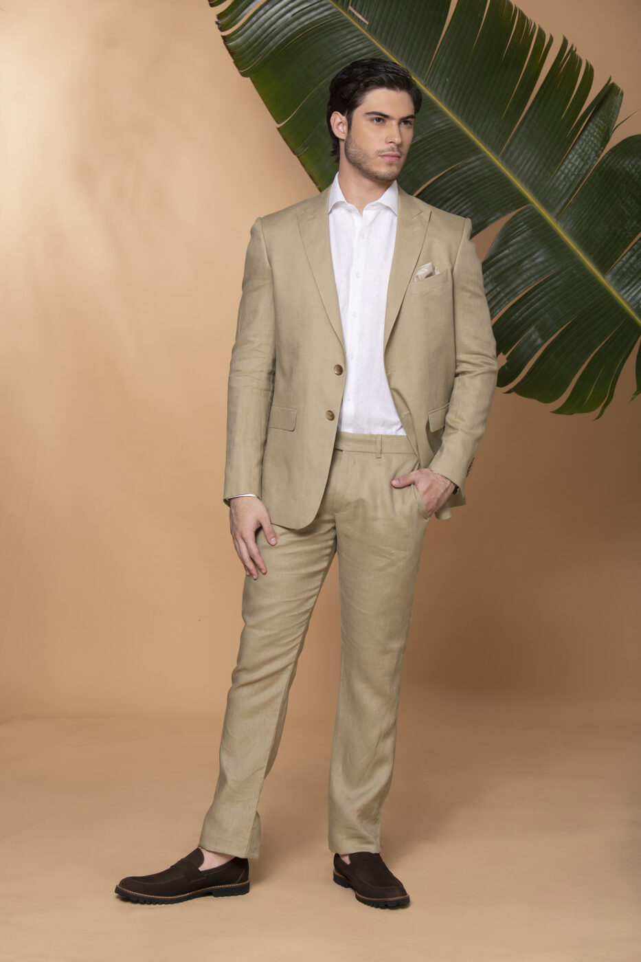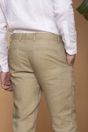 Pantalón confeccionado en tejido 100% lino. Slim fit: este fit presenta una silueta ligeramente ajustada al cuerpo, ceñida en la cintura y las piernas. Pretina cruzada. Cierre mediante cremallera con botón frontal y botón interior. Dos bolsillos laterales diagonales. Dos bolsillos doble ribete en la parte posterior.