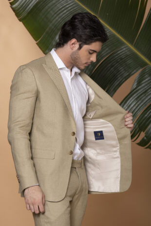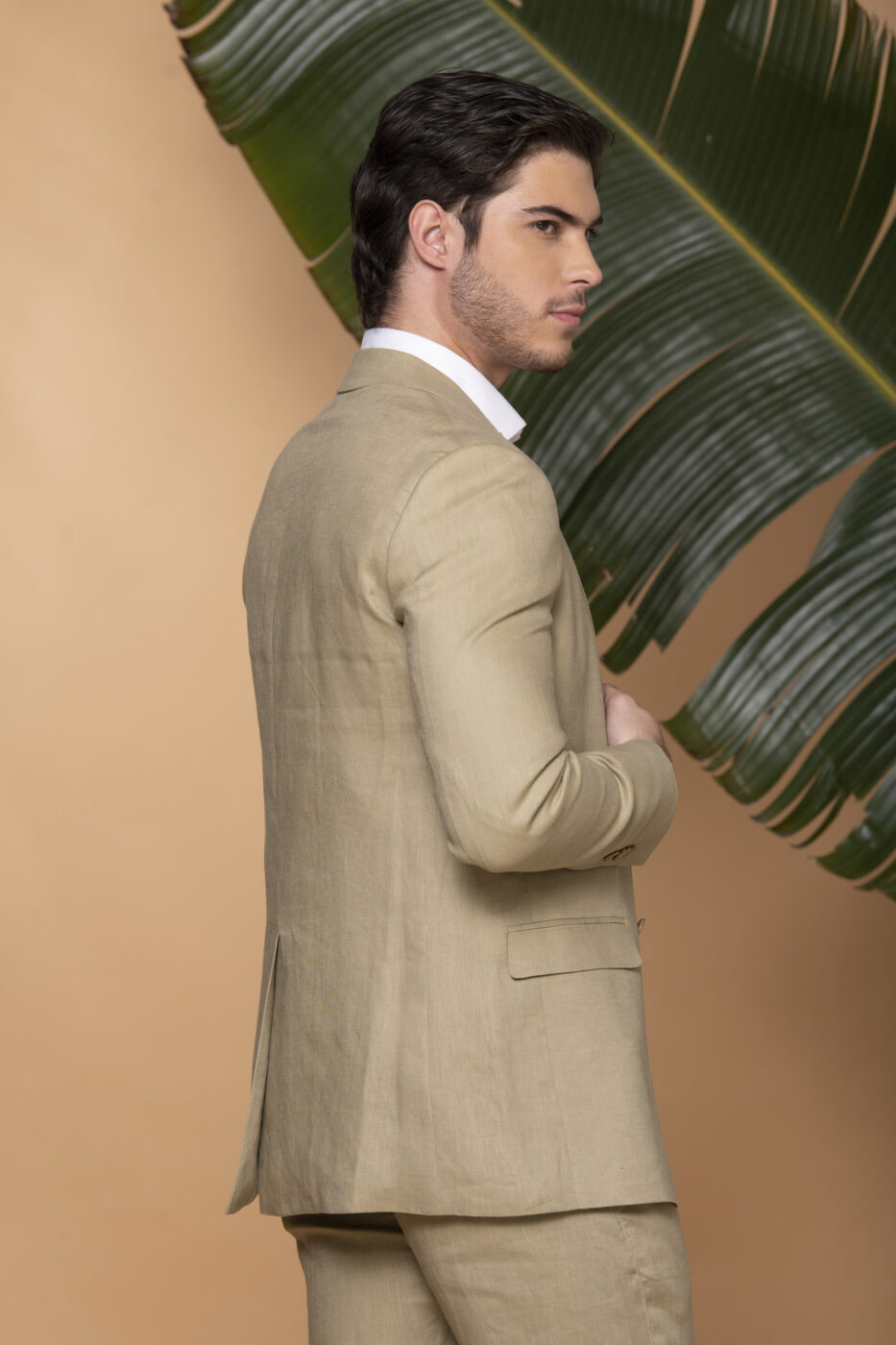 Chaqueta confeccionada en tejido 100% lino. Cuello con solapa en punta y ojal. Puño abotonado. Cierre mediante dos botones. Dos bolsillos con tapas. Un bolsillo a la altura del pecho. Bolsillos interiores. Bajo con una abertura central.